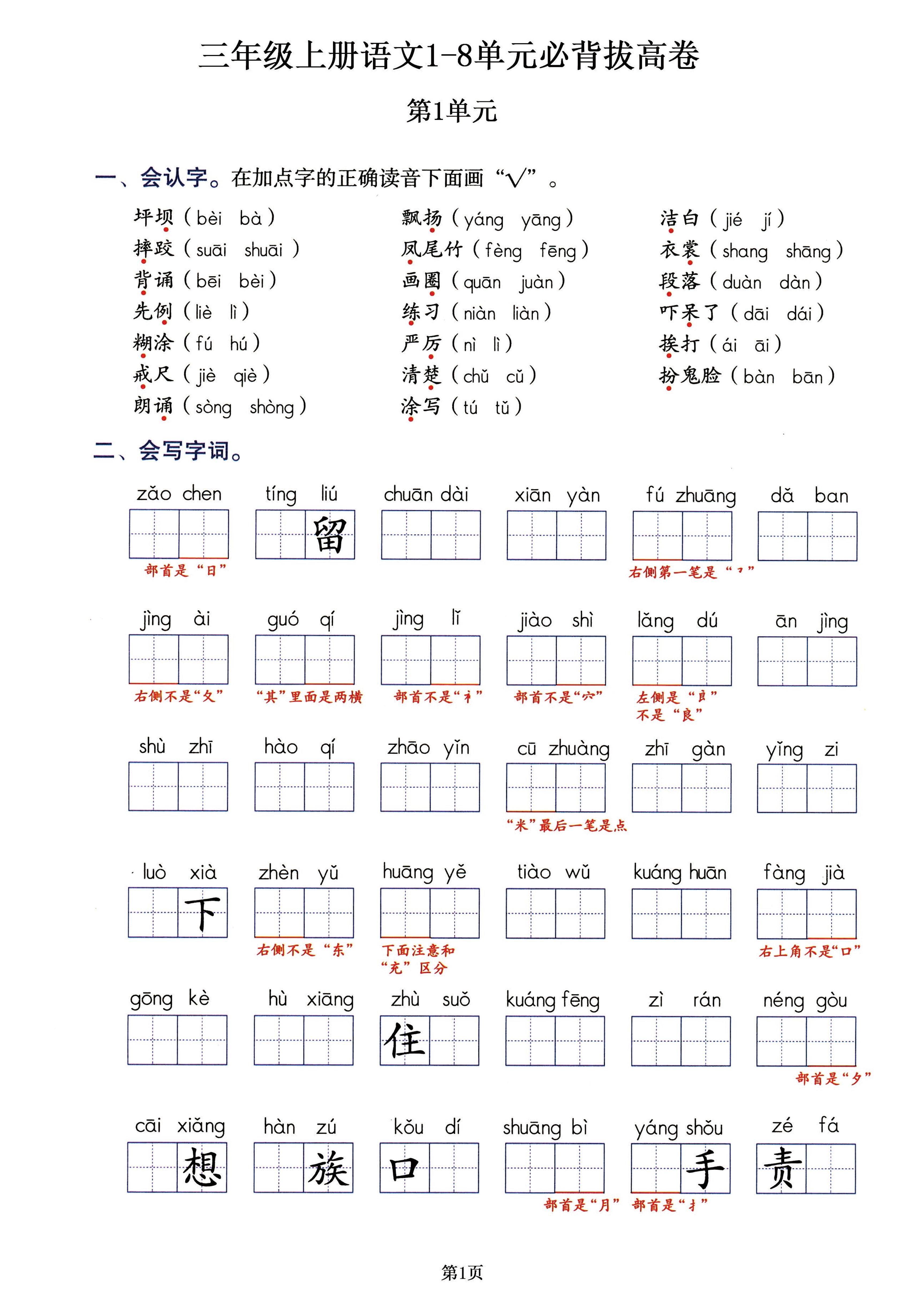 三年级上册语文必背拔高卷,吃透1-8单元所有考点就靠它!共18页
