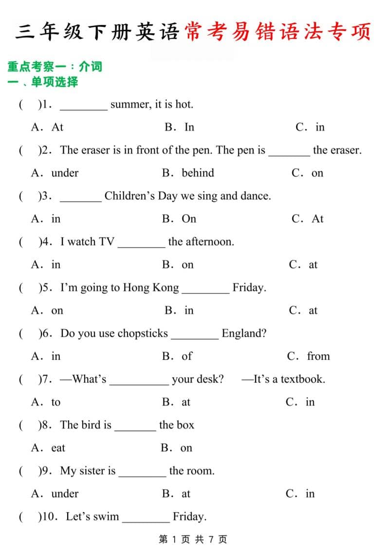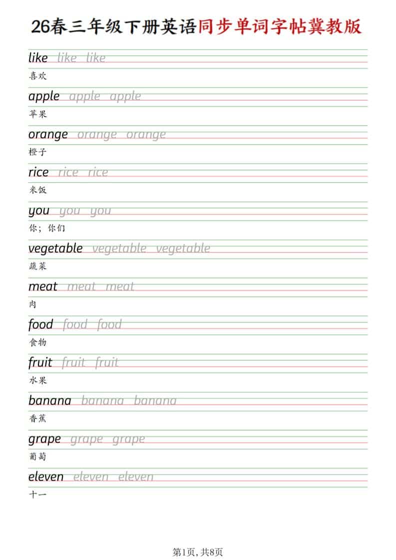 三年级下英语寒假专题专项小纸条《人教版PEP》