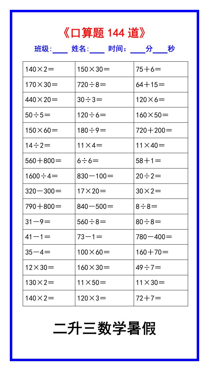 二升三数学暑假《口算练习题144道》汇总-三上数学