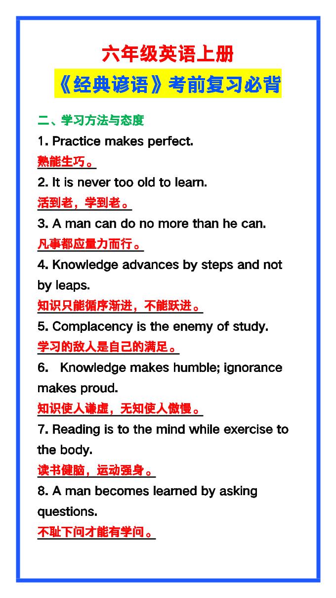 【2025秋新版】六年级英语上册《经典谚语》,考前必背!