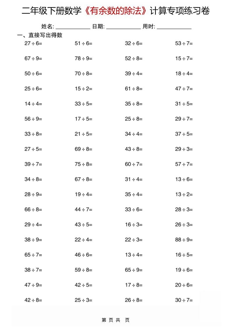 二年级下数学《有余数的除法》计算专项练习卷